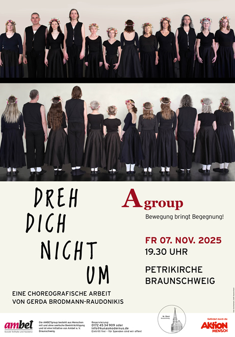 In diesem Jahr feiert die Agroup ihr 10-järiges Bestehen. Sie strebt nach immer neuen Formen; Mischungen aus klassischem Ballett, Performance und modernem Tanz, an unterschiedlichen Auftrittsorten wie Museum, Kirche, Schloss, Zirkuszelt oder Industrieraum. Die Orte nehmen Einfluss auf die Stücke – die unterschiedlichen Kulissen sind inspirierende Quellen für das Ensemble. Die Choreografin Gerda Brodmann-Raudonikis konzipiert ihre Stücke speziell für die Auftrittsorte. Das Tanzstück befasst sich mit den inneren Kämpfen und Herausforderungen des Lebens, aber auch mit dem Mut aus einer gescheiterten Situation einen Ausweg zu finden. Die Agroup besteht aus Menschen mit und ohne seelische Beeinträchtigung und ist eine Initiative von Ambet e.V. Braunschweig. Bewegung bringt Begegnung!