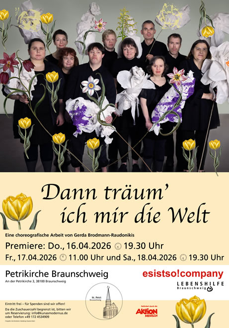 DANN TRÄUM ICH MIR DIE WELT ist ein Tanztheaterstück der esistso!company der Lebenshilfe Braunschweig, das Hoffnung und Realität miteinander verbindet. Das Stück zeigt die kreativen und künstlerischen Fähigkeiten von Menschen mit Behinderung und setzt sich mit Themen wie Träumen, Wünschen und den Herausforderungen des Alltags auseinander. Die Tänzer bringen ihre persönlichen Erfahrungen und Perspektiven ein, wodurch eine authentische und berührende Aufführung entsteht.